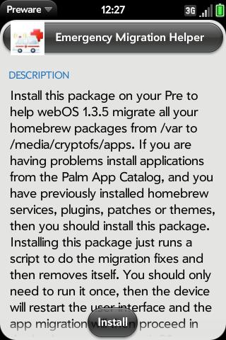 僕のPalm Preは度重なるwebOSのVerUPを経て、Palm App Catarogからダウンロードした無料アプリでもインストールに失敗するようになっていました。インストールしたアプリのアイコンにビックリマークがついていて、実行できないのです。その問題を解決するかもしれない「Emergency Migration Helper」というアプリ(スクリプト)を試してみました。