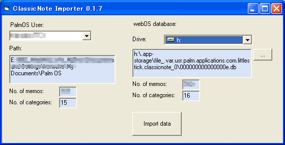 左側で旧PalmOS機のHotsync IDを選び、右側でPalm Preのドライブを選択します。Import dataのボタンを押すとカテゴリ毎にインポートするかを訊いてくるので、Yes,Noを選択します。