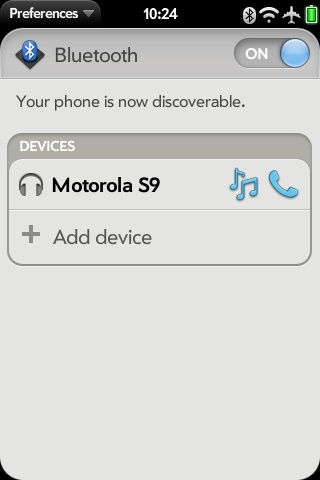 S9の電源ボタンを長押しすると、青いランプがつきます。そこでPalm PreのBluetoothをONにすると、機器が検索され、認識したらPreで0000と入力するとペアリング完了です。