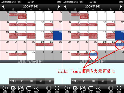 「さいすけ」もカテゴリ毎に表示できるので、新たに「domo Todo」というカテゴリを作り、そこで「domo Todo+」のタスク管理を行えば、非表示にすることにより通常のスケジュールに混在することはありません。逆に「domo Todo」というカテゴリも合わせて表示してやると、タスクの締め切りがスケジュールの中に色分けされて表示されます。これは便利です。