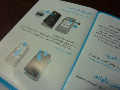 さて、注文して数日で到着したXperia mini Proですが、まずは電池を入れようと裏蓋をはずそうとしましたがなかなかとれません。うれしくて急ぐあまり裏蓋のツメを折ってしまう・・・そんな初歩的ミスを犯すほど素人ではありません(過去に経験済なので)。ここは深呼吸、冷静に箱から説明書を出しました。説明書を開くと、なんとそこに書かれた文字はアラビア語。しかたがないので辞書を片手に訳しながら作業を進める・・・わけもなく、とりあえず世界共通語の「図」をみることにしました。世界共通語の「図」のおかげで無事裏蓋をはずすことができ、次に電池を箱から出そうとしたときに、よくみると説明書がもう一冊ありました。英語でした。説明書が分かれているとは全く思いませんでした。ユーザーをひっかけるなんて、ソニエリもなかなかやり手だなぁ・・・と思いましたが、真の「ひっかけ」はこの後にあるのでした。
